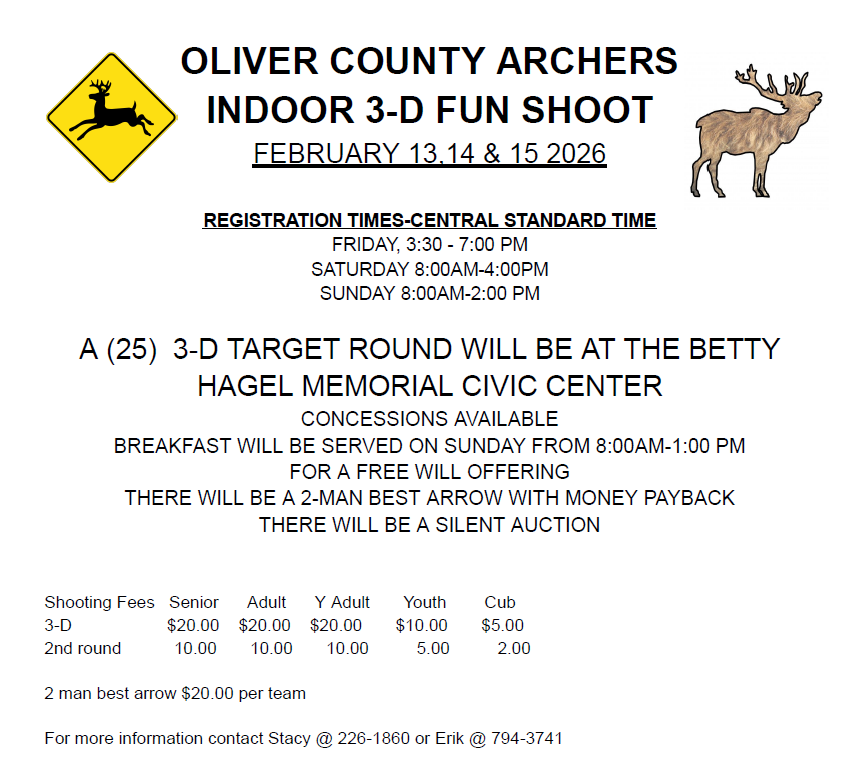 Indoor 3-D Fun Shoot hosted by the Oliver County Archers. See the attached flyer for more information!