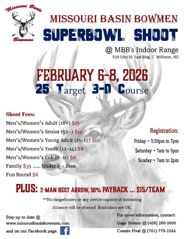 Join us in Williston for the Missouri Basin Bowmen Super Bowl Shoot! Check back for more information and the event flyer!